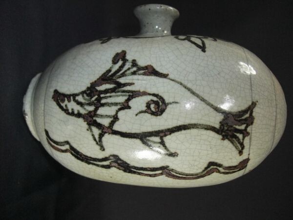 - 【睦】李朝 鉄絵 魚文 偏壺 染付 逸品 俵壺 共箱■