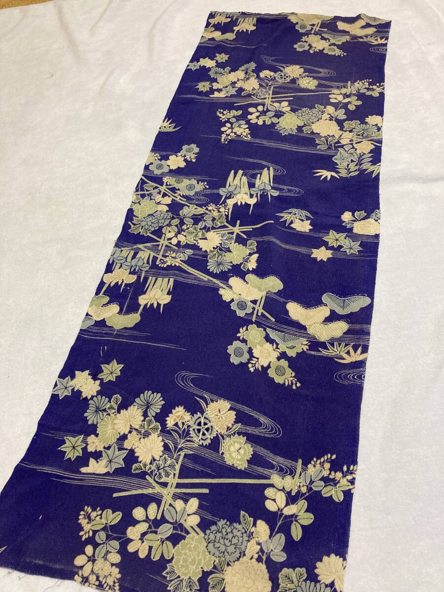 - 正絹錦紗縮緬 古典花柄流水模様生地(約100×35cm) アンティーク