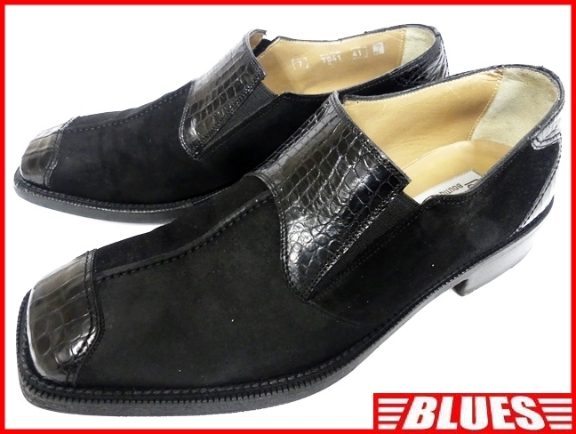 > 即決★イタリア製 Romano Martegani★25.5cm レザーサイドゴアシューズ ロマーノマテガーニ メンズ 黒 クロコ型押し 本革 ヒール 本皮 革靴