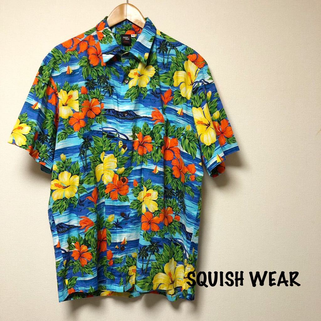 > SQUISH WEAR*メンズXL アロハシャツ 半袖シャツ コットンシャツ ハワイアンシャツ 柄シャツ ハイビスカス 涼感 アメカジ USA古着