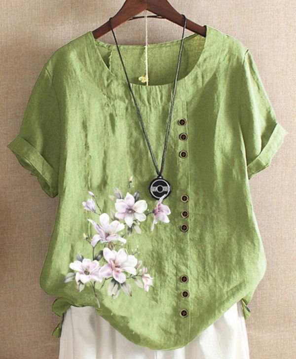 > 人気推薦 / 夏新作 上品 大人 花柄 ブラウス 大きいサイズ 綿麻 カジュアル きれいめ プリント柄 半袖 トップス チュニック / グリーン