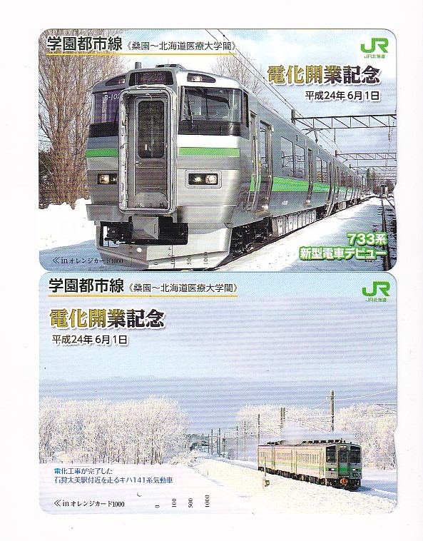 > JR北海道 学園都市線 電化開業記念キハ141系・733系新型電車 記念オレンジカード1穴使用済2枚組 札沼線