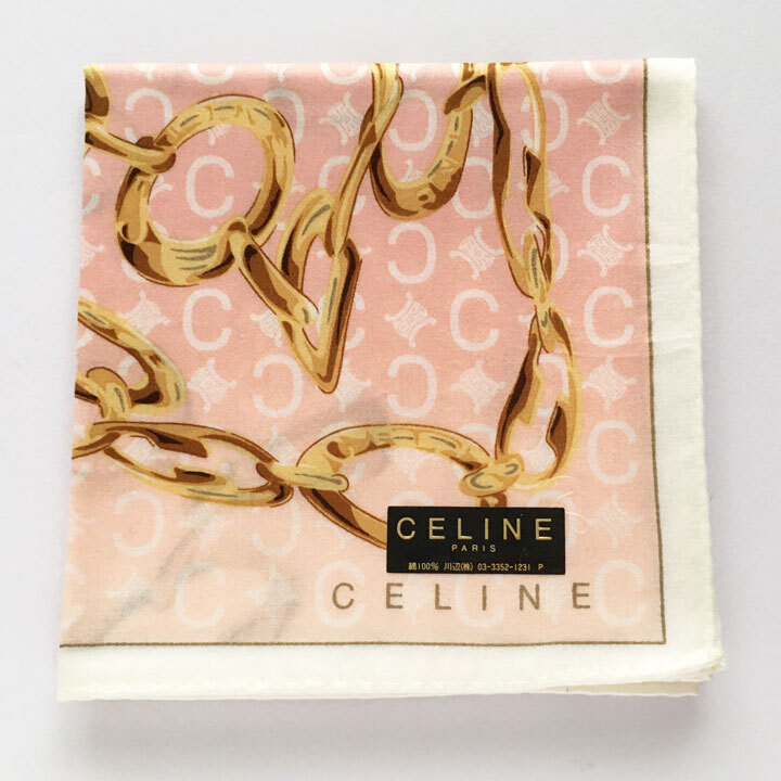 > セリーヌ / CELINE ハンカチ 金チェーン柄 C&マカダム模様ピンクグラデーション生地 白ふち【6236】