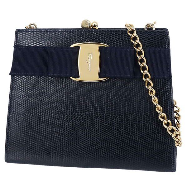 - フェラガモ がま口 ミニバッグ ヴァラ レザー ネイビー ゴールド 3117