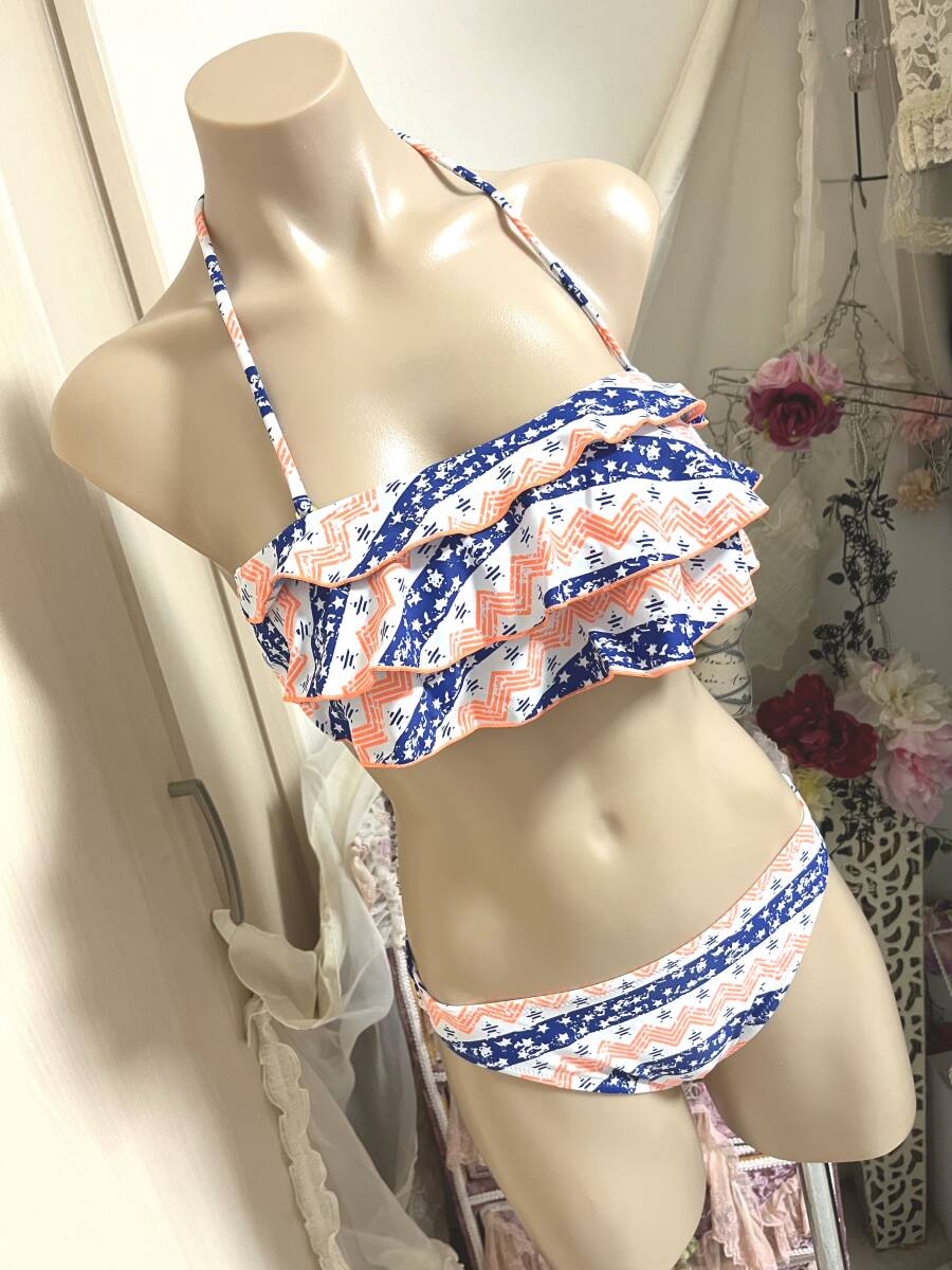 - レディース水着9Mサイズ:ピクシーパーティ【Pixy Party】フリルバンドゥビキニ*パレオスカート水着・3点水着:蛍光オレンジ*紺