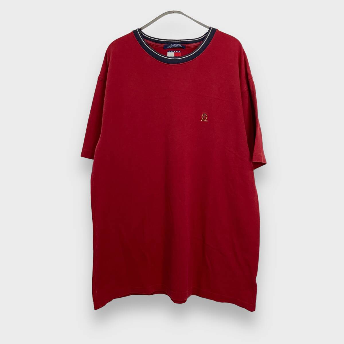 > ☆送料無料☆TOMMY HILFIGER☆鹿の子コットンワンポイントTシャツ赤系☆XL☆90s☆エンブレム☆H24M