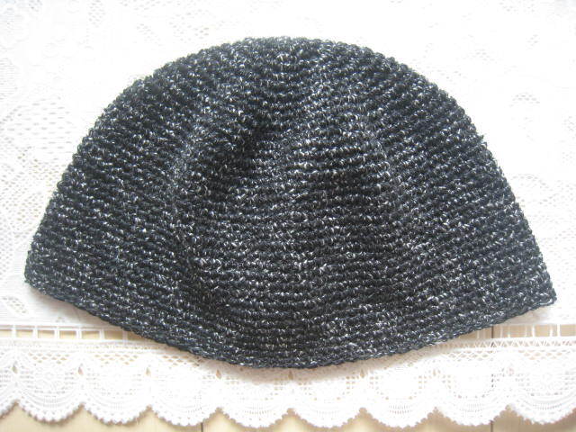 - 即決/ハンドメイド 手編み 通気性よい コットンリネン★綿麻 少し大きめ 高さ16cm/杢黒/帽子/ビーニー ニット イスラム帽/アウトドア