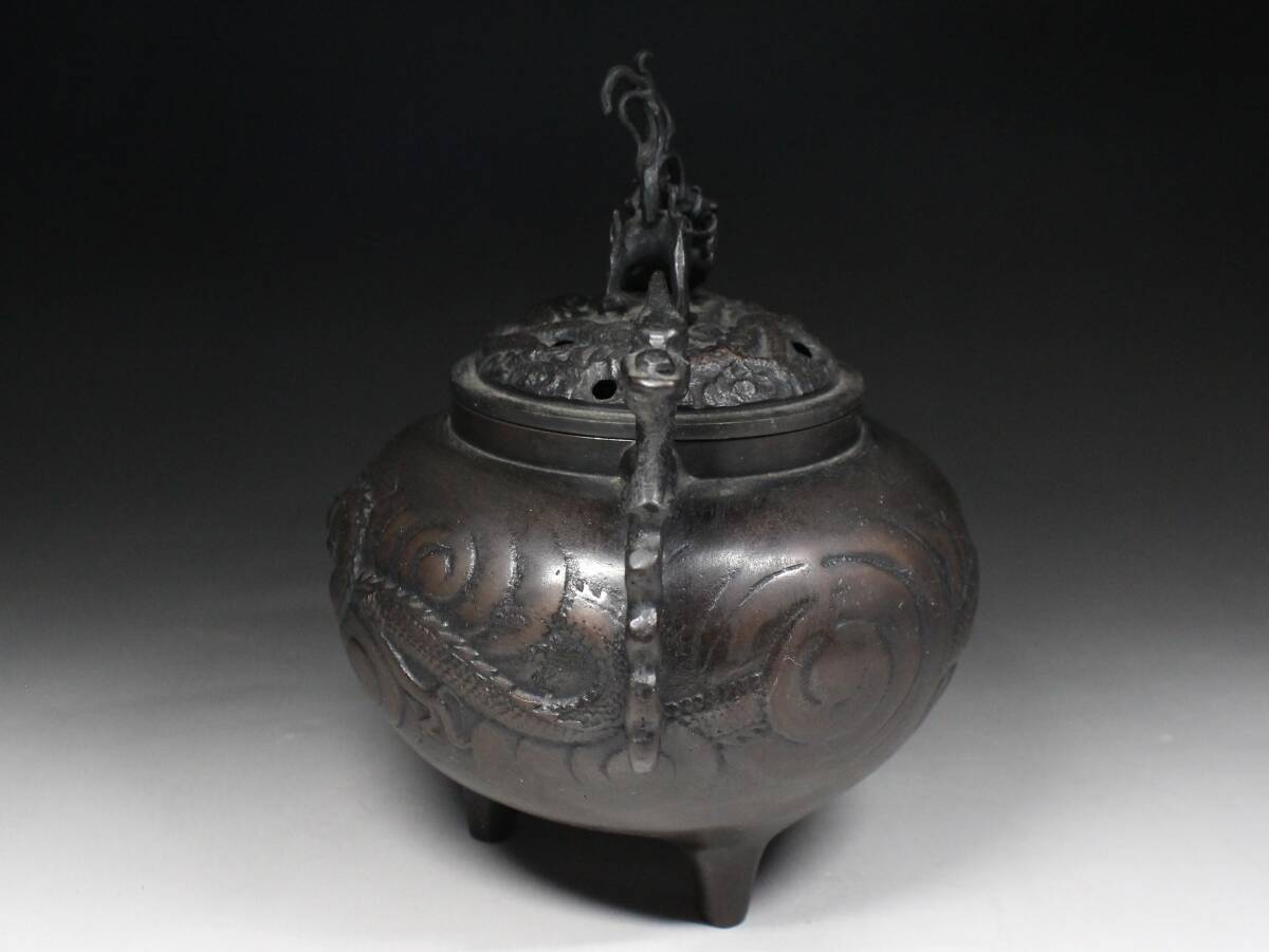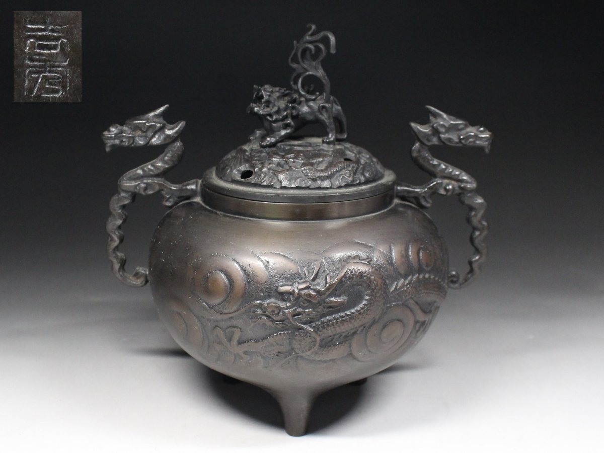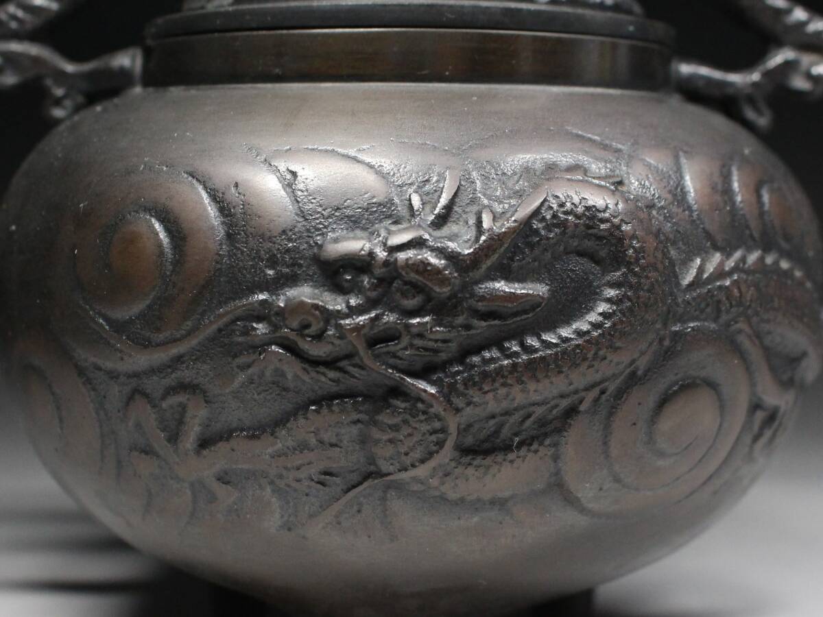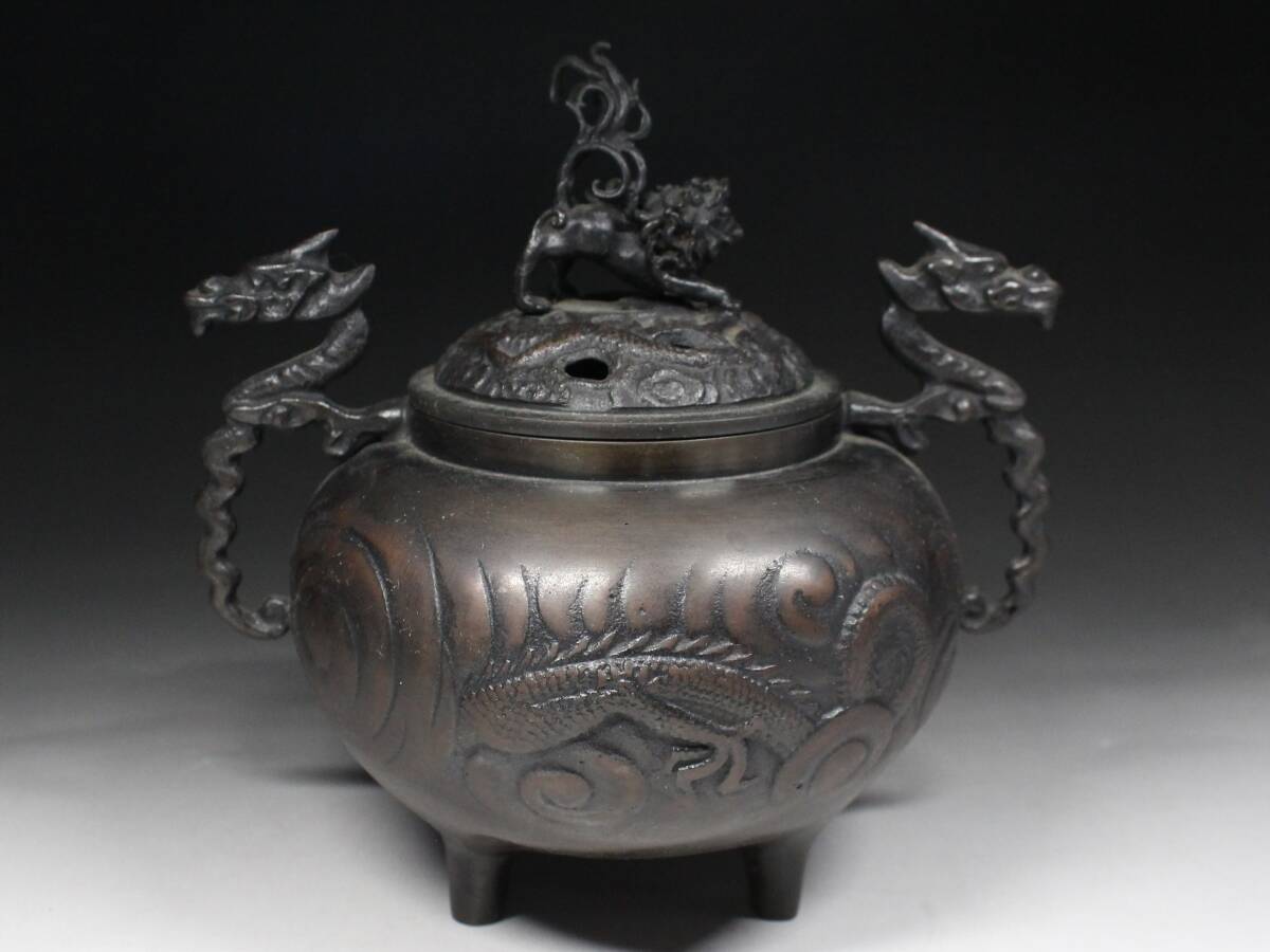 - ◆古銅・龍紋盛上彫・龍双耳・三足香炉・獅子摘蓋・在銘・煎茶道具・香道具◆a3121h
