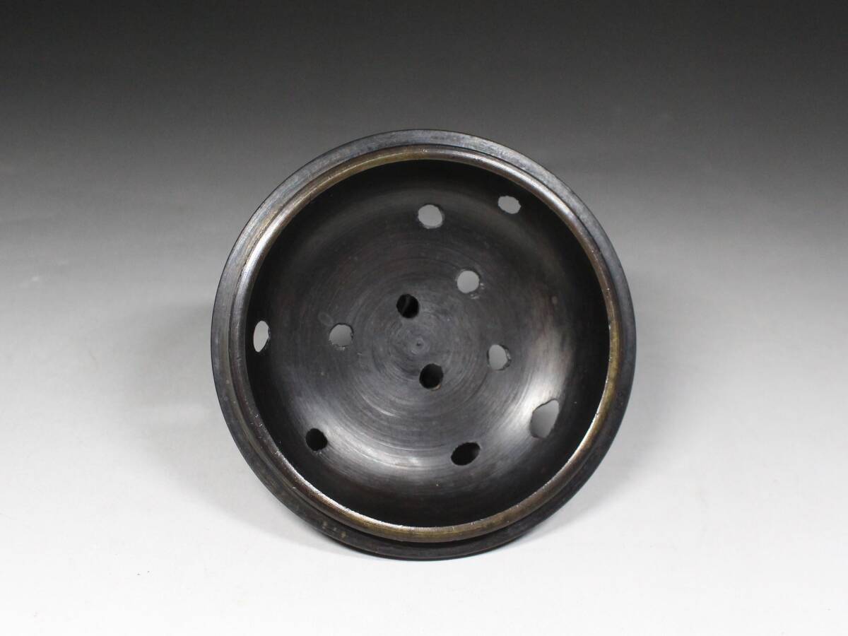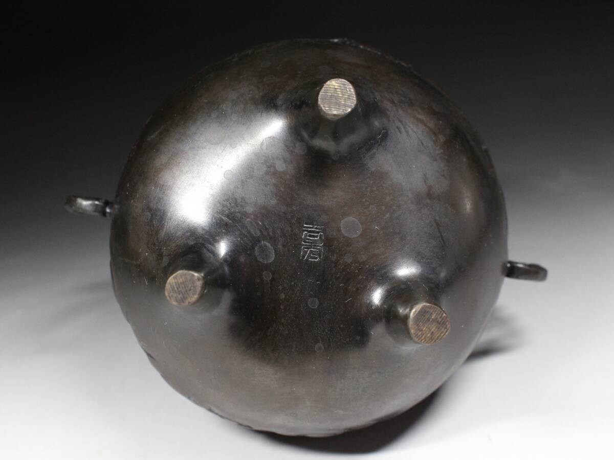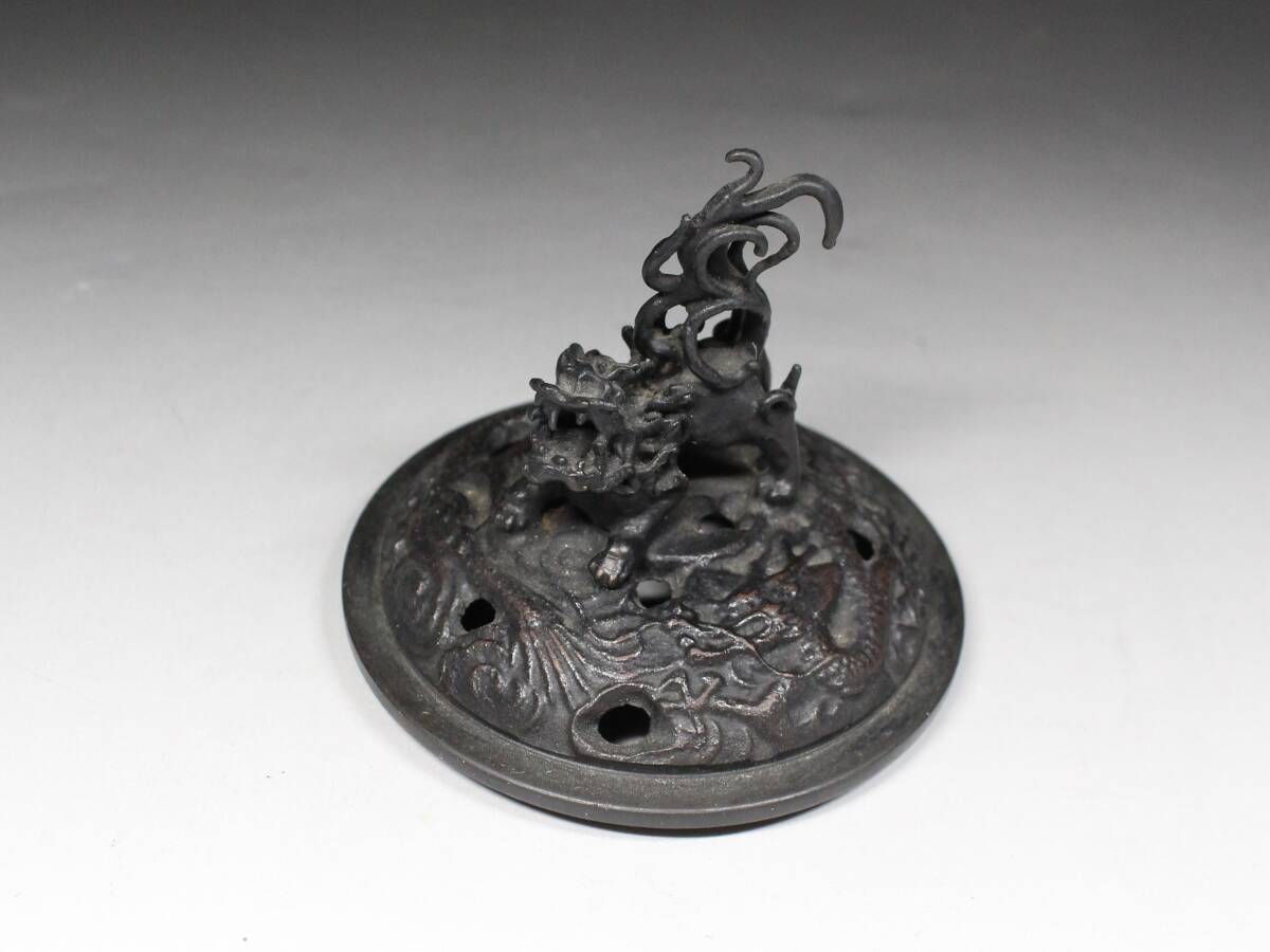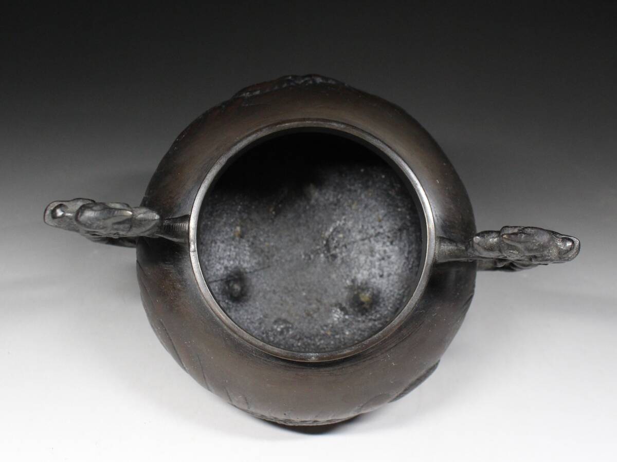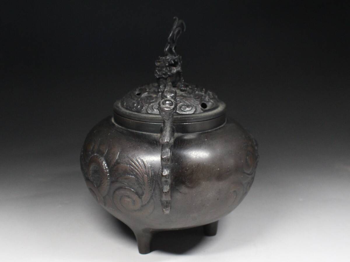 - ◆古銅・龍紋盛上彫・龍双耳・三足香炉・獅子摘蓋・在銘・煎茶道具・香道具◆a3121h