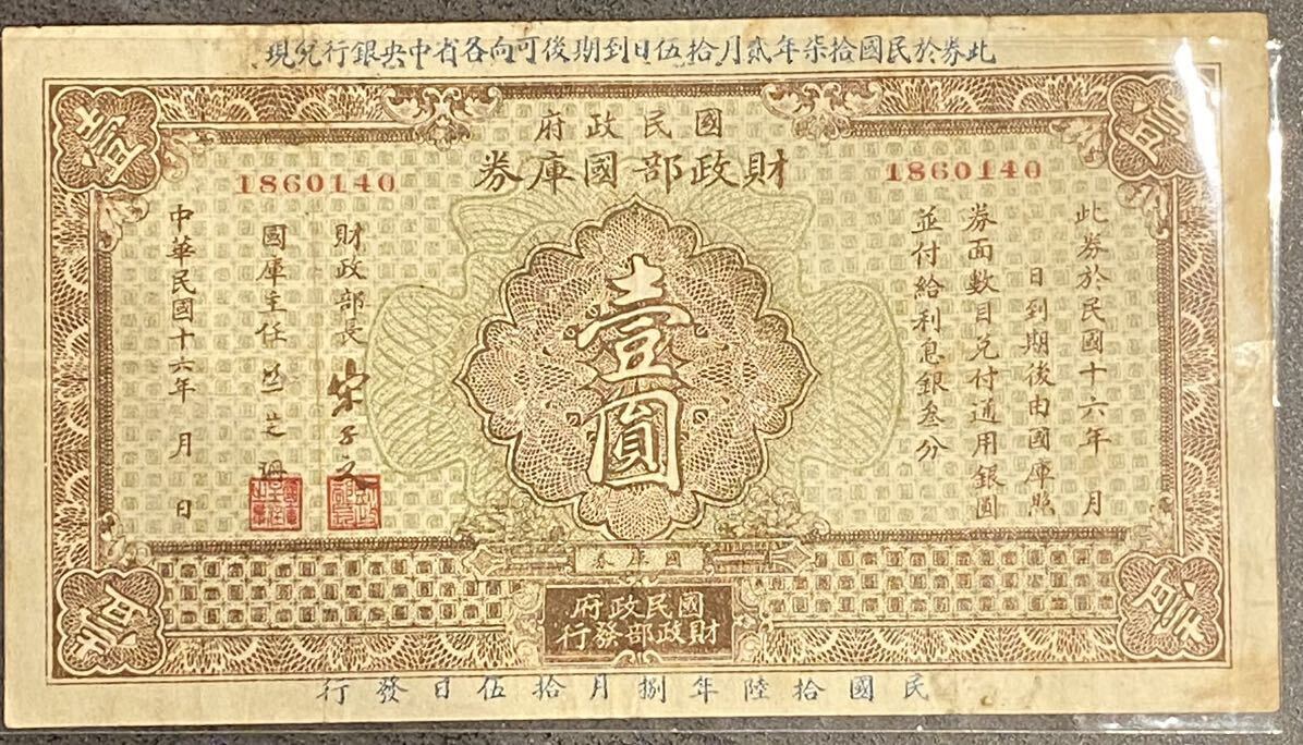 - 中国紙幣 国民政府 財政部国庫券 壹圓 中華民国16年9月15日発行 旧中国紙幣 紙幣 民国紙幣 中華民国 海外紙幣 外国紙幣