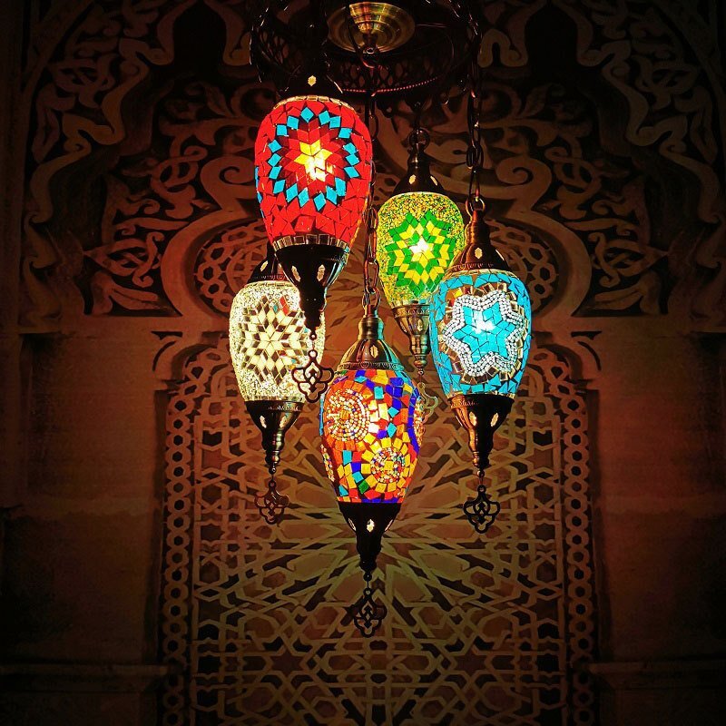 > モロッコ職人手作り カラーガラス 吊り下げ照明 5灯式 古風 リビング、寝室、レストラン、カフェー、ホテル、民宿、バー 飾り
