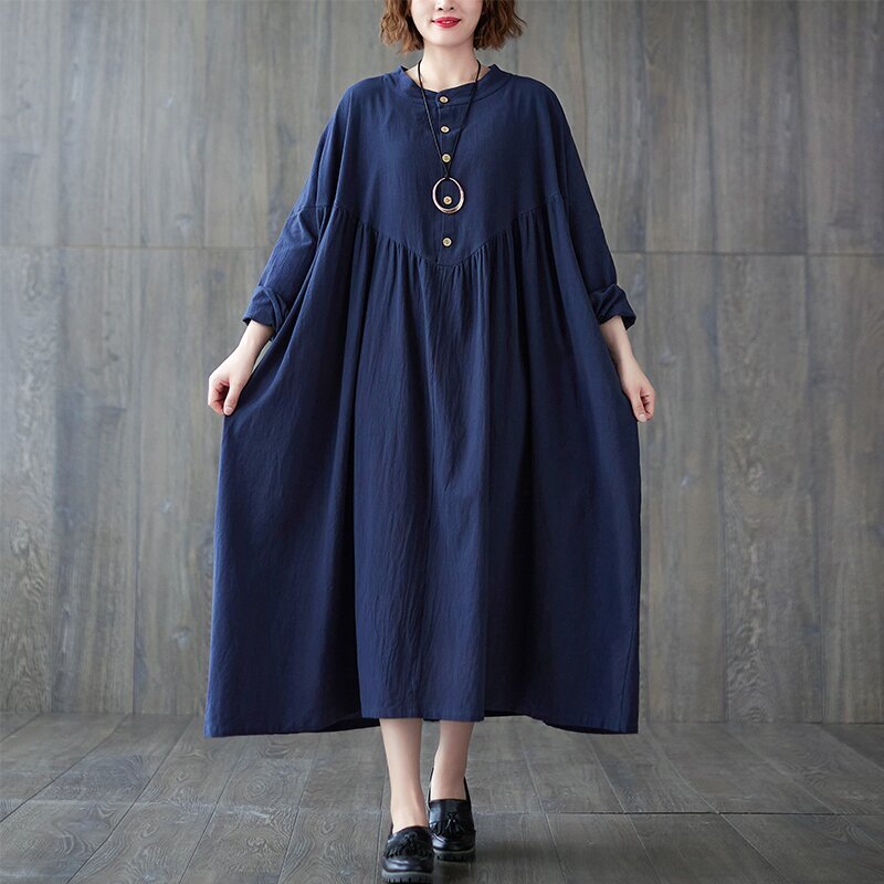 - 新入荷* カジュアル 綿麻 ワンピース マキシ丈ワンピース マキシワンピース 体型カバー 無地 長袖 大きいサイズ ロングワンピース*ネイビー