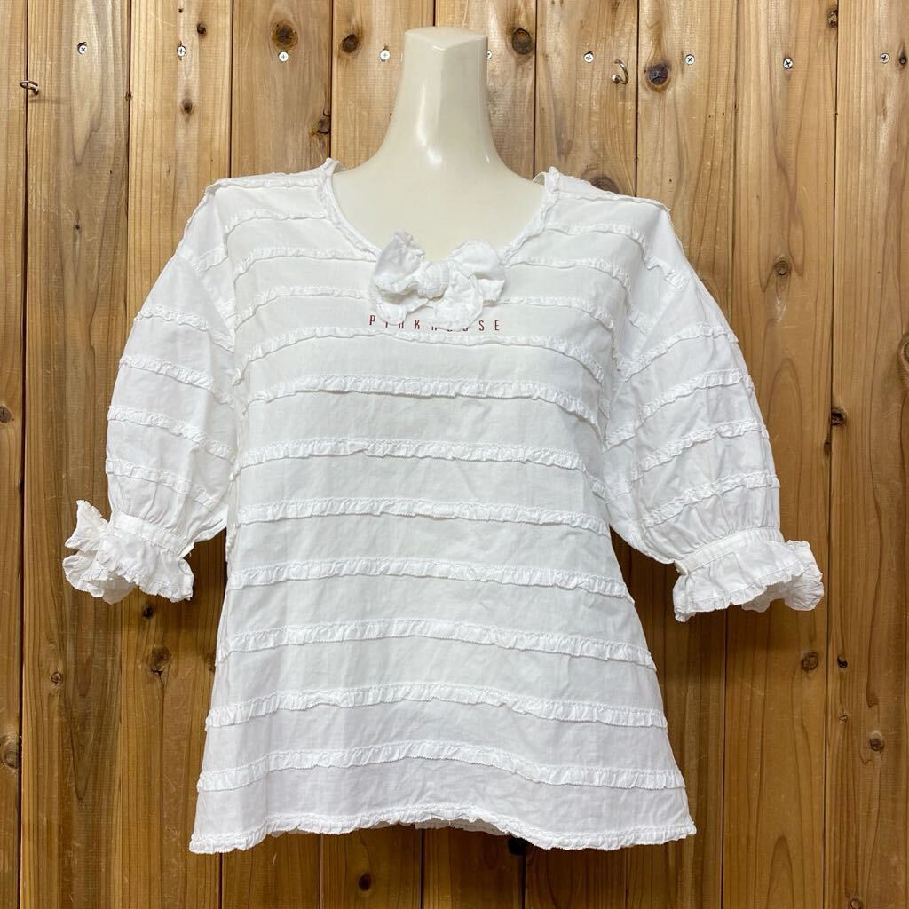 - 美品☆PINKHOUSE * ピンクハウス 半袖 綿ローンブラウス リボン×フリル仕様 ホワイト 白ブラウス 胸ロゴ 白シャツ