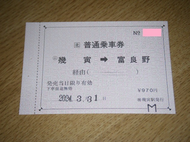 - 【JR北海道】根室本線幾寅駅発行 幾寅→富良野 常備券片道乗車券 廃止最終日付大人1枚【2024.3.31日付】 .