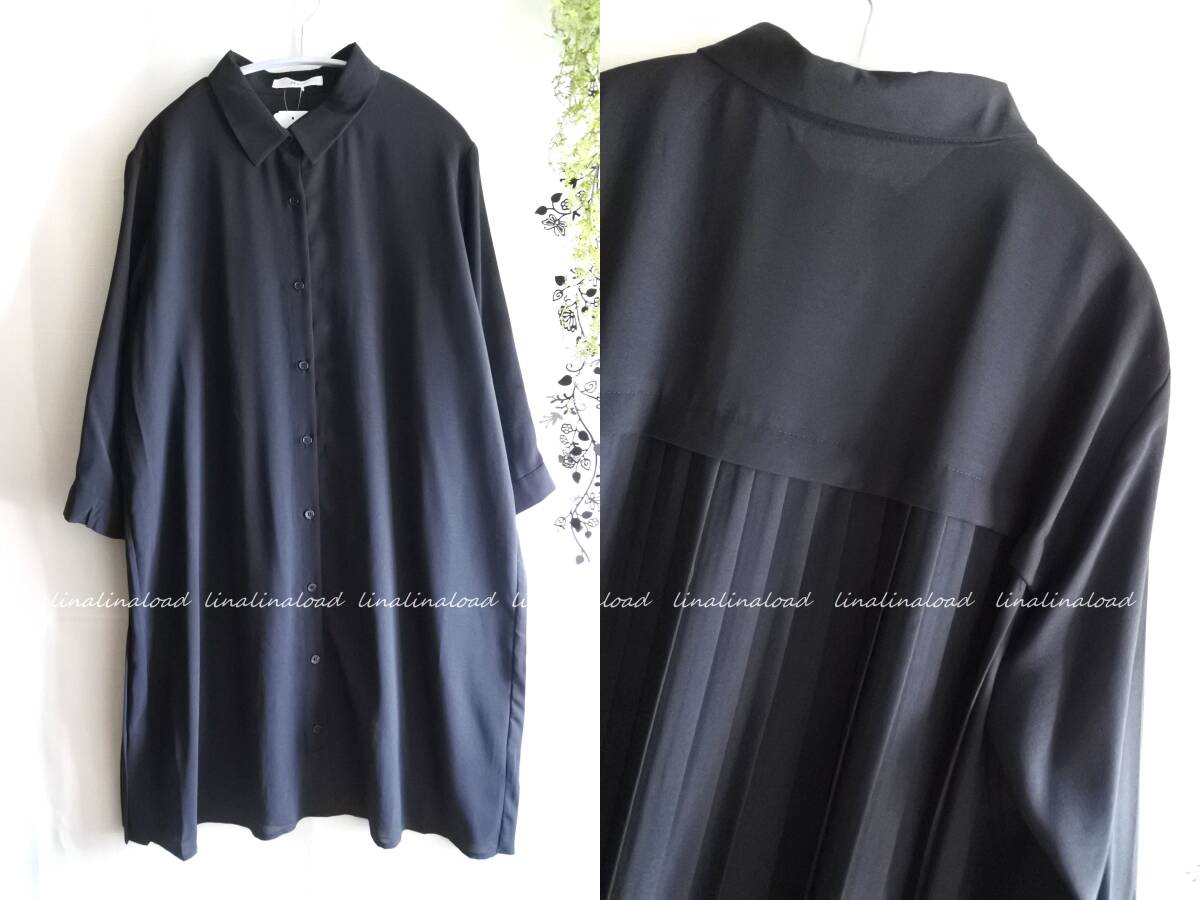 - 未使用タグ付 JINTI* ジョーゼット バックプリーツ 七分袖 シャツチュニックワンピース ブラック LL① ニッセン イージーケア