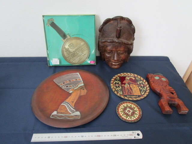 - 海外 おみやげ 外国製 金属 皿 木彫り 飾り 壁掛け セット 金属製4点 木製2点 ジャンク品