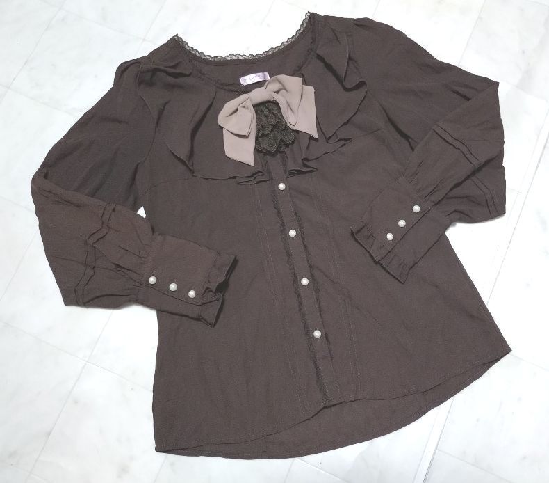 > ★ アクシーズファム axes femme 長袖 ブラウス M ★ ブラウン 茶色 フリフリ リボン シャツ ★