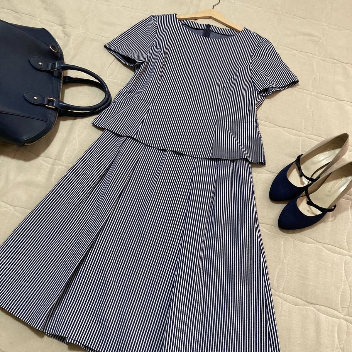 > 986*レリアン 7*極美品*爽やかなネイビー系ストライプのセットアップ*涼しいサッカー素材*サイズ7