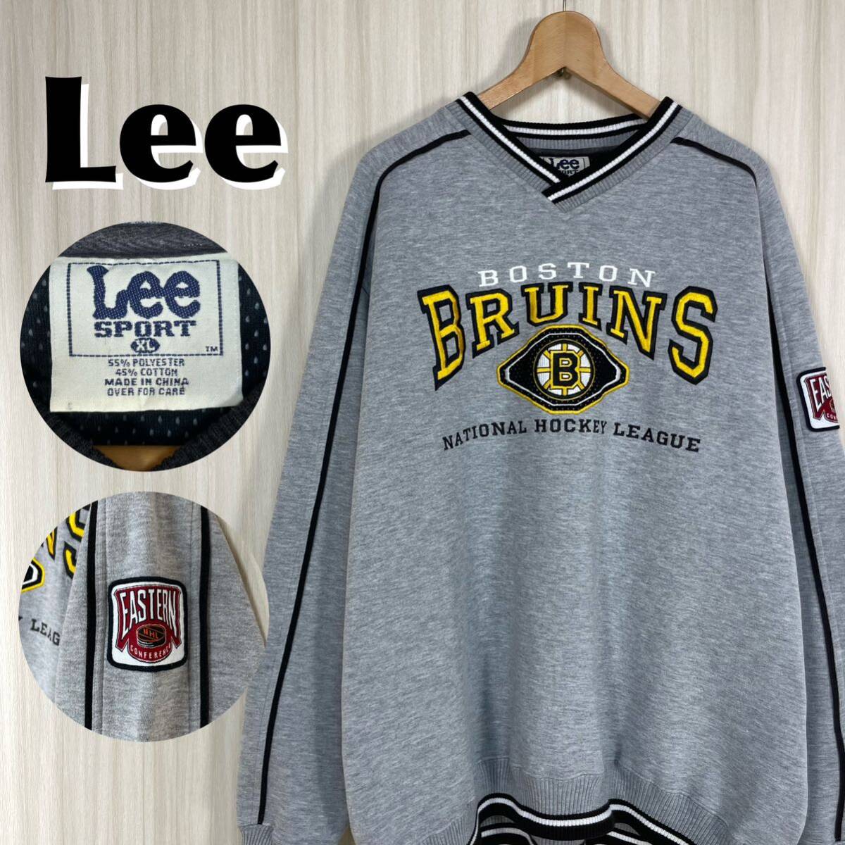 > ☆入手困難☆Lee NHL アイスホッケー ボストン・ブルーインズ 全刺繍 ビッグロゴ Vネック 裏起毛 スウェット トレーナー 霜降り XL 古着