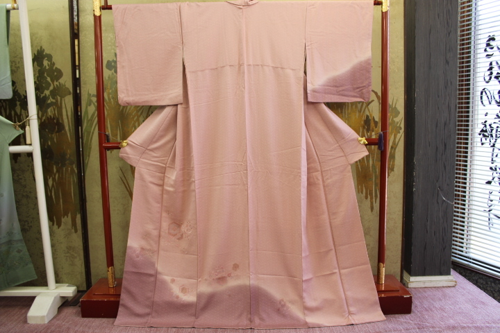 - きもの今昔7538 付け下げ訪問着 広衿袷仕立て 正絹ちりめん地ローズ色裾濃い暈しに紗綾型地汕頭刺繍 身丈168cm