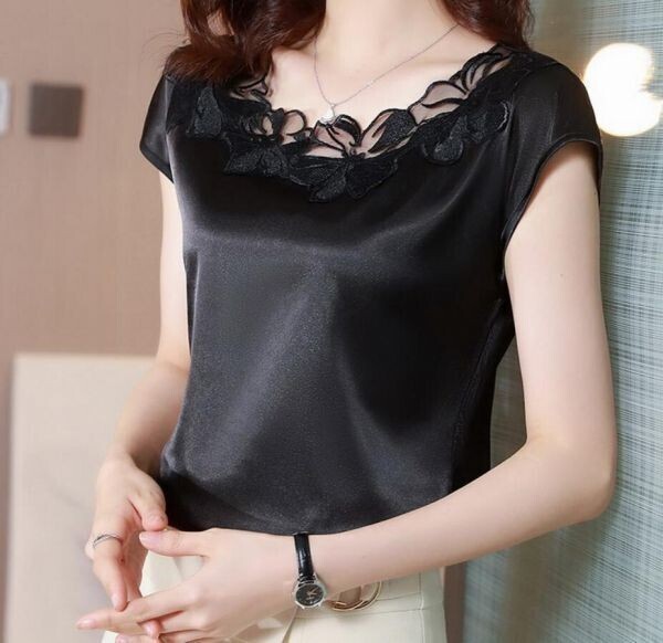 > 夏新作 / エレガント シャツ 着痩せ レース切り替え つるつる サテン トップス 優雅 通勤 大人 半袖 ブラウスシャツ / ブラック