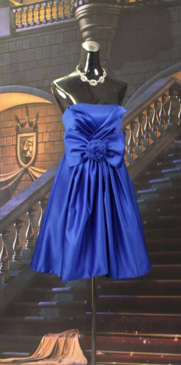 - カクテルドレス ビスチェタイプ ブルーサテン生地 S~Mサイズ 膝丈スカート