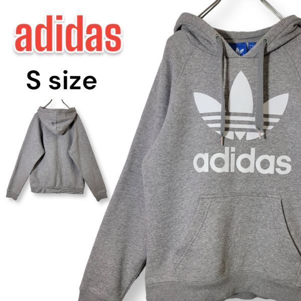 > 【定番】adidas アディダス ビッグロゴ トレフォイル プルオーバー パーカー Sサイズ グレー スウェット フーディ