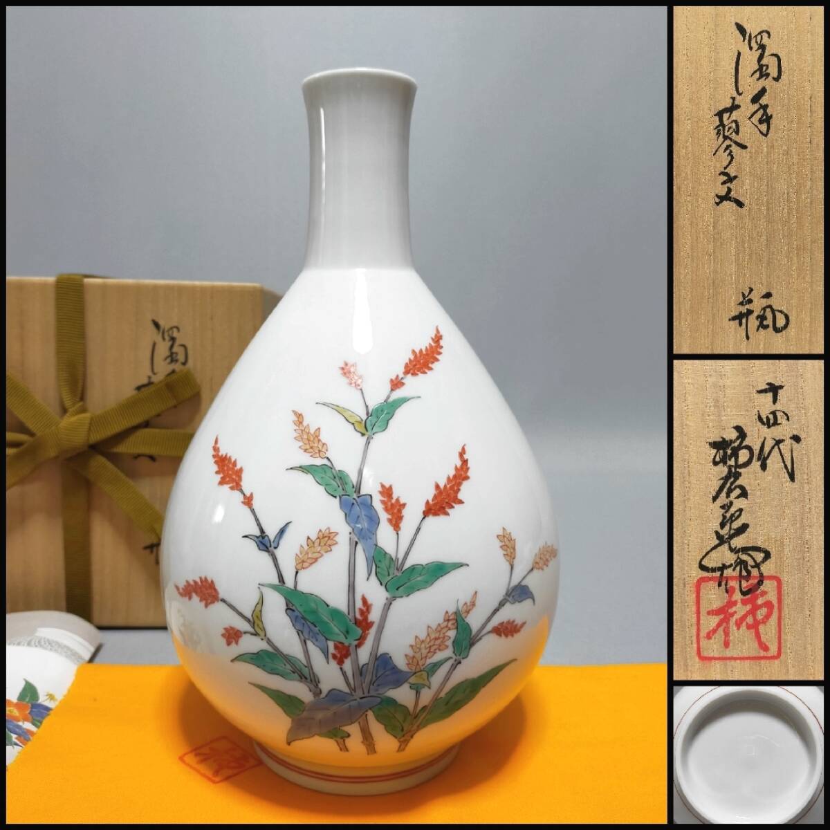 > TK28 花瓶 人間国宝 十四代 酒井田柿右衛門 本人作 濁手 蓼文 瓶 花入 高23cm 栞・共布・共箱 茶道具 華道具