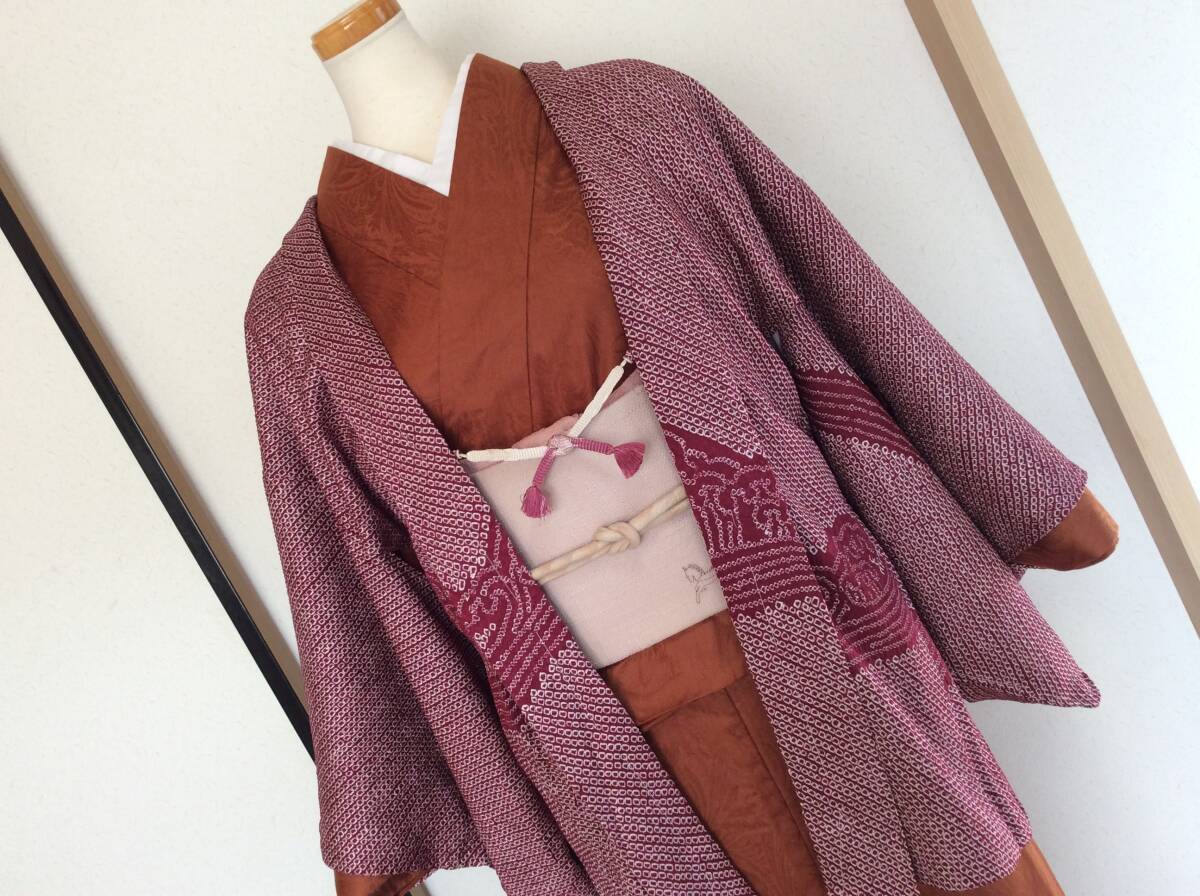 - 即決 アンティーク羽織 羽織紐付き 裄丈65 総絞り えんじ色 波柄 定形外郵便込 これからの秋冬シーズンの和装コーデに♪