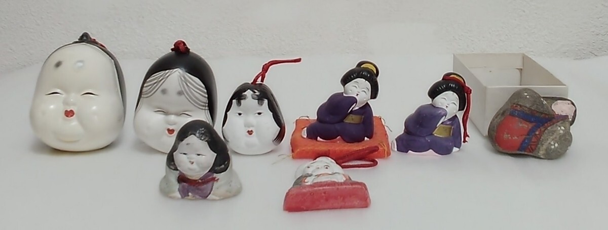 - ★ 初出し 古い 土鈴 御多福 おかめ お福 色々 8体 商売繁盛 縁起物 飾り物 置物