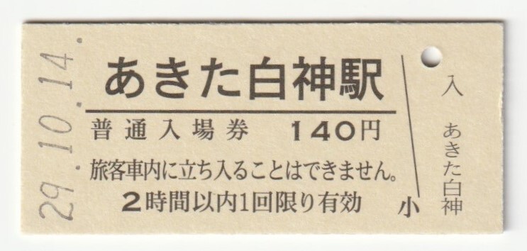 - 平成29年10月14日 五能線 あきた白神駅 140円硬券普通入場券
