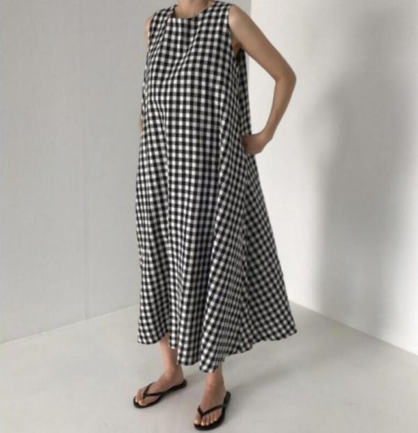 - 夏新作 / カジュアル 綿麻 チェック柄 ノースリーブ ワンピース ゆったり コットン リネン Aライン ワンピース ロングワンピース /XLサイズ
