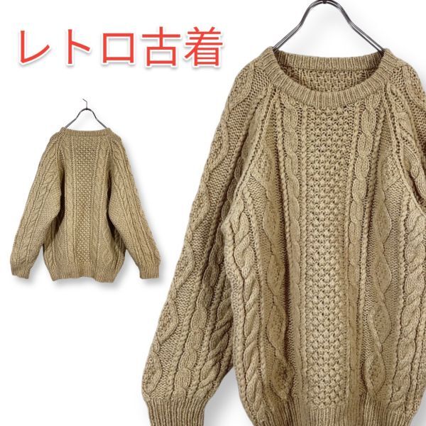 - 【美品】レトロ 90s ウール ニット セーター 白系 ケーブル編み 手編み ハンドメイド