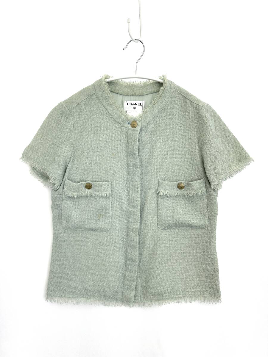 - 6J2714【本物保証】シャネル 半袖 ジャケット ツイード シャツ フリンジ ブルー coco ココマーク ボタン #36 08C P32207 CHANEL