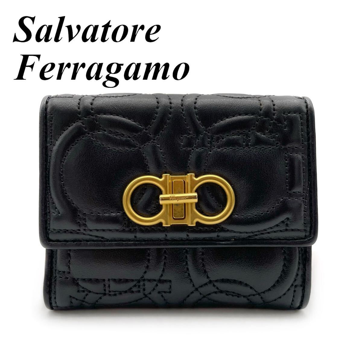 > フェラガモ ダブルガンチーニ コンパクトウォレット キルティング ブラック