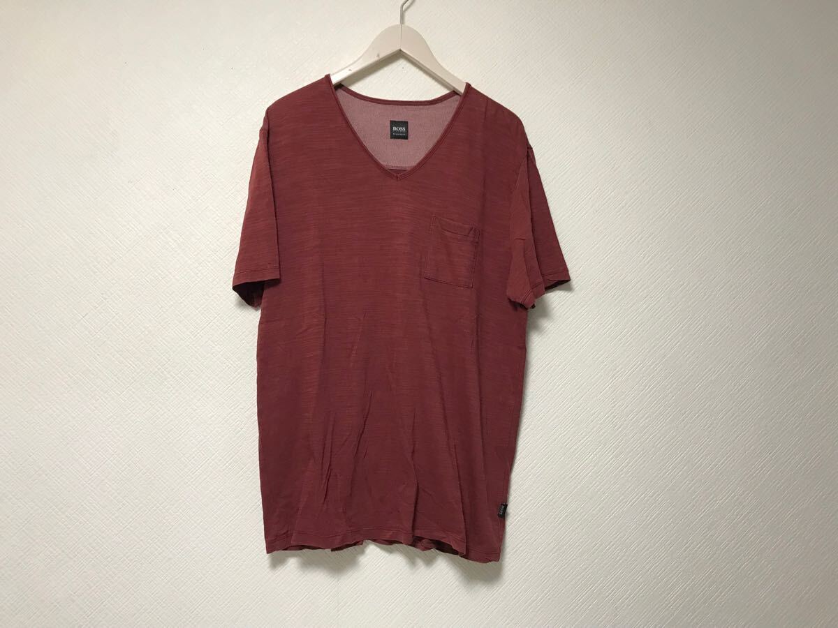 - 本物ヒューゴボスHUGOBOSSコットンスラブVネック半袖TシャツメンズサーフアメカジミリタリーストリートドレスXLエンジ赤ワインレッド