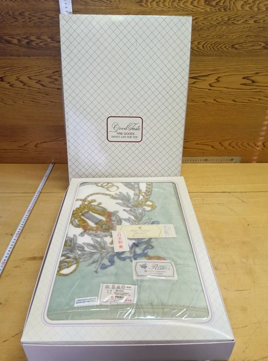 - 24110220 京都西川 綿100%掛け毛布 グリーン 花柄 日本製 ローズ毛布 掛け毛布 未使用品