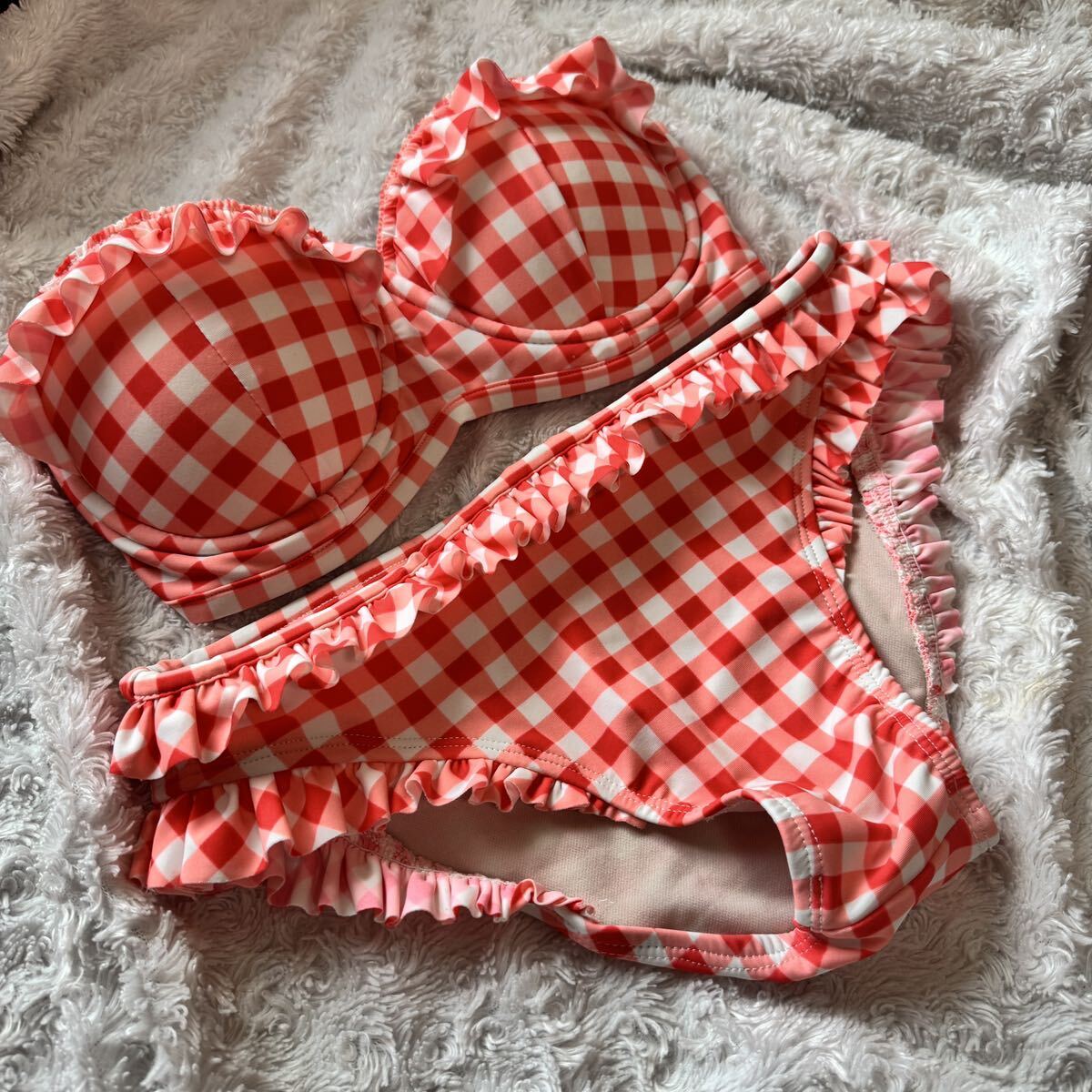 - 赤ギンガムチェック水着 チューブトップ レース フリル ビキニ セクシー エロい レトロ かわいい キュート ラブリー 谷間