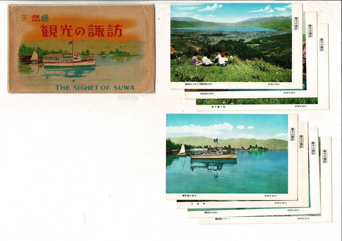 - 天然色 観光の諏訪 THE SIGHT OF SUWA レトロ絵葉書(戦後)7枚と封筒 封筒に破れ・書き込み 高島城の桜/片倉館/霧ヶ峰 RPS06124SM12