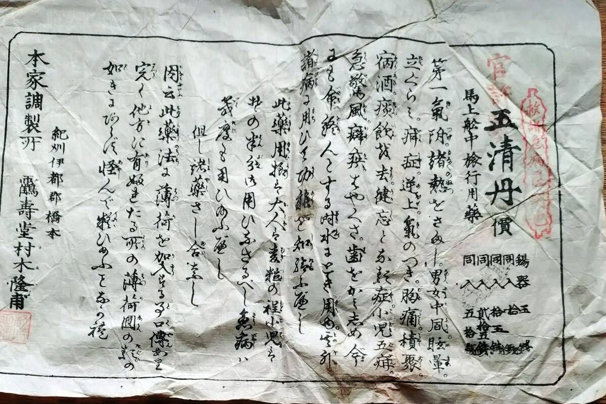 - f24111115〇一枚刷物 摺物 木版 広告 五清丹 鶴寿堂 紀州橋本 和歌山県 江戸時代〇和本古書古文書