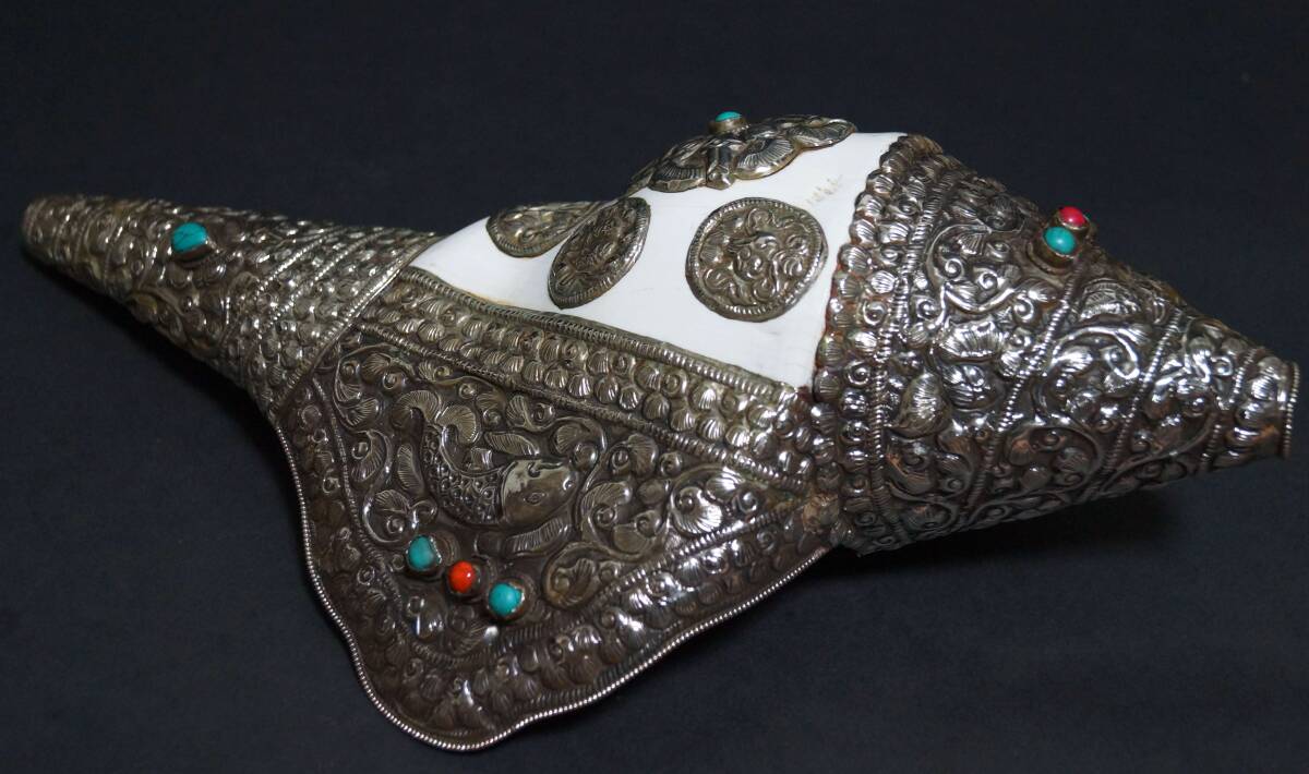 - 【閑】オールドチベット法具 大型左巻法螺貝(トゥンカル)純銀巻きターコイズ&コーラル象嵌 手造り打出し装飾チベット寺院使用★6D1116