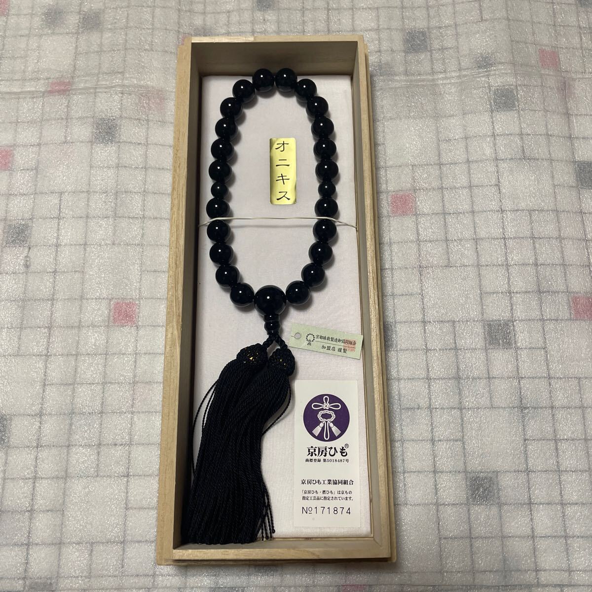 - 未使用 御念珠 念珠 御数珠 京房ひも 22玉 正絹頭付房 京念珠 メンズ 男性用 天然石 オニキス 法事 仏具 葬儀 桐箱入り