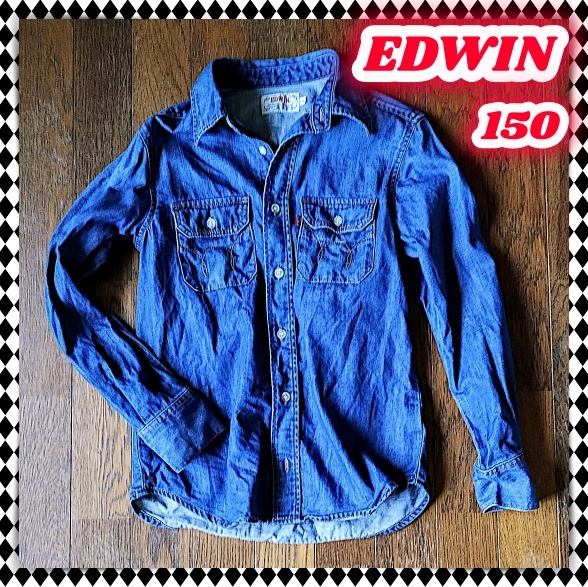- EDWIN エドウィン デニムシャツ 150 長袖 ジャケット ウエスタン ウォッシュ加工 インディゴブルー 青 ストレッチ カジュアル 古着 原宿