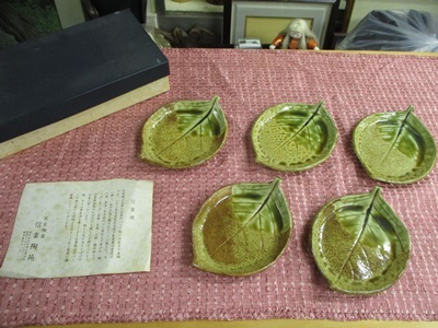 - 信楽焼 お皿 直人 5枚 葉っぱの形 16×13cm 箱の状態悪い tm2411-22-3