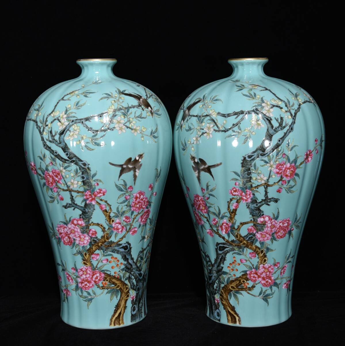 - ◆旧家蔵出◆古美術 中国古玩 大清雍正年製款 粉彩 緑地 描金 十二喜 花鳥紋梅瓶―對 古賞物 骨董 時代物 A06