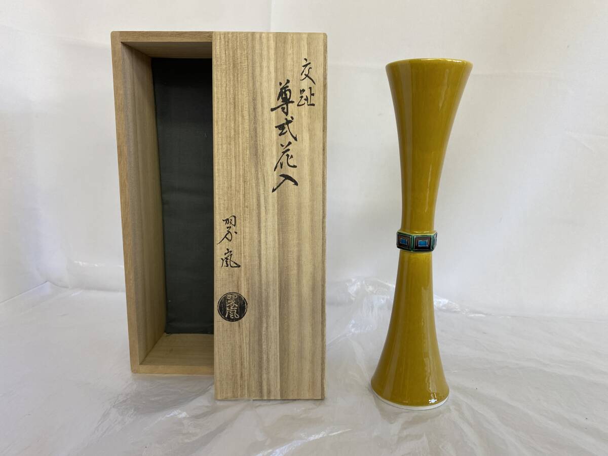 - 【無傷完品】 古代 黄交趾 中村翠嵐 尊式花入 花器 花瓶 花入 花生 一輪挿し 桐共箱 共布 栞 未使用 表千家 裏千家