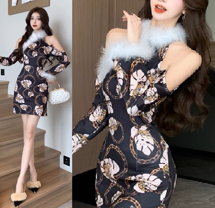 > ラス1*新品*セクシー*エロかわ♪ぴったりボディライン♪ 良質 とろみ素材 肩開き ファー 付 総柄 タイト ワンピース 黒 ブラック