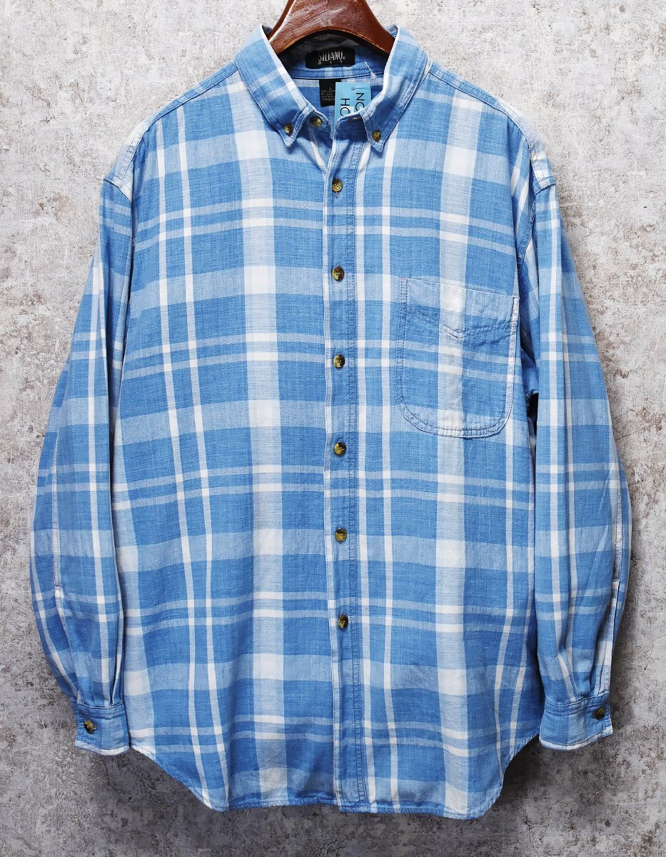 - ビンテージ STEFANO MAN ステファノマン 水色x白 チェック柄 コットン ボタンダウンシャツ サイズL DG2918-5-DI27