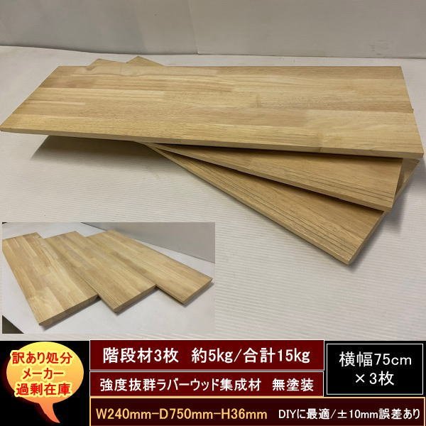 - 送料無料 訳あり処分 階段材 240-750-36mm 強度抜群 ラバーウッド集成材 3セット 合計約15kg 無塗装 DIYにお勧め!
