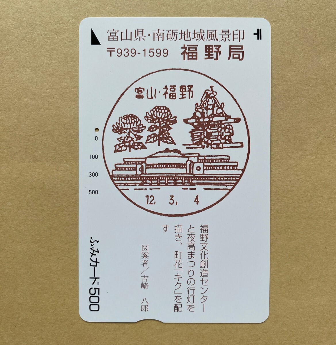 > 【使用済】 ふみカード 富山県・南砺地域風景印 福野局 福野文化創造センターと夜高まつりの行灯を描き、町花「キク」を配す